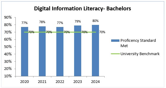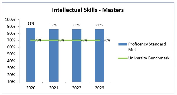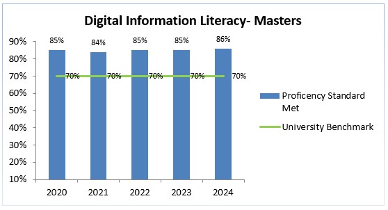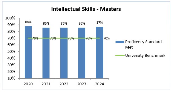 A snapshot of student achievement, in reaching APUS' Institutional Learning Outcomes, is captured using assessment tools within the classroom. Signature assignments, found throughout each academic program, are one measure used to assess students’ success. When aggregated, the results show proficiency in meeting our institutional learning outcomes. American Public University System considers a student’s performance on a signature assignment to show proficiency when an 85% is earned. APUS strives to have 70% or more (university benchmark) of students reaching the 85% proficiency standard. When this benchmark isn't met, action is taken to improve curriculum and instruction.